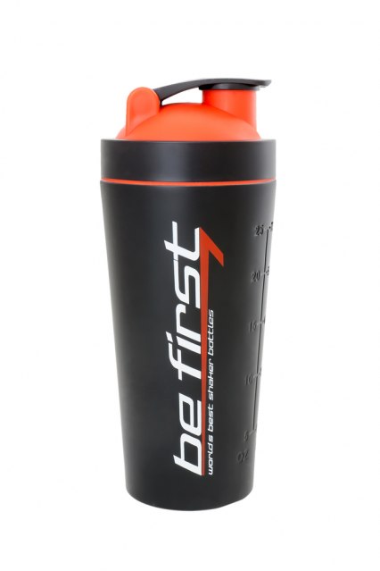 Этот спортивный шейкер от компании Be First изготовлен из металла – высококачественной пищевой нержавеющей стали. Это дает спортивному шейкеру ряд преимуществ. Например, большую прочность. Возможно, это не кажется особенно важным, но с другой стороны – при падении на пол металлический шейкер останется целым в любом случае. Еще один весомый плюс – высокая плотность и полная инертность металла. Это позволяет шейкеру не впитывать запах даже очень сильно ароматизированных продуктов и даже после многих месяцев постоянного использования. Мойка металлического шейкера не доставит особых хлопот – его можно подвергать любым очищающим процедурам – даже мыть в посудомоечной машине. И, наконец, долговечность металлического шейкера ничем не ограничена – его гораздо сложнее поцарапать, он не потускнеет со временем, многие сотни смешанных коктейлей не оставят на нем никакого следа. Крышка хорошо закручивается и герметично закрывает шейкер. Сетка представляет собой одно целое с крышкой, так что отдельно снять ее не получится. Но поскольку ячейки очень крупные, проблем с мойкой крышки возникнуть не должно. Еще в крышку заделана силиконовая прокладка, дополнительно герметизирующая соединение – ее тоже иногда нужно будет вытаскивать и мыть, чтобы там не оставались частицы протеина или гейнера. Объем шейкера 739 мл – хватит и для протеина, и для БЦАА, и для гейнера. На корпусе нанесена мерная шкала. Корпус, конечно, непрозрачный, но шкала выполнена методом тиснения и ее видно с внутренней стороны, что поможет точно отмерить нужное количество жидкости.